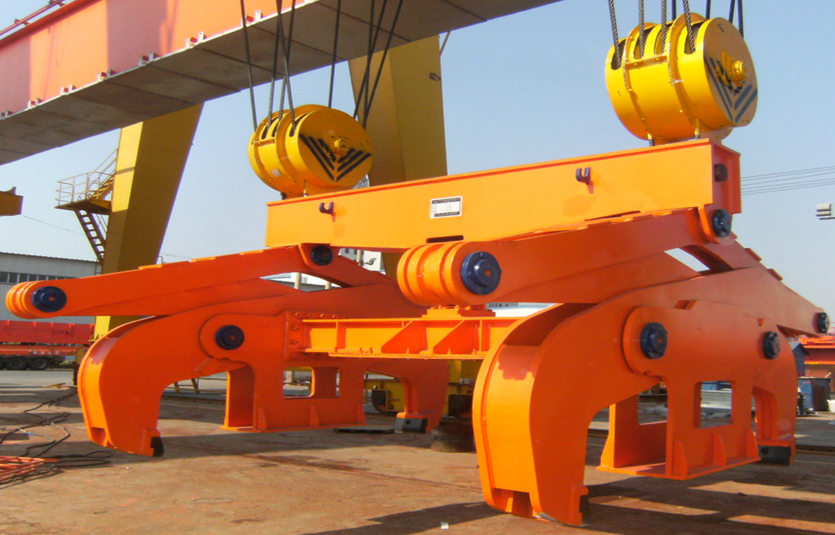 7、 雙吊點夾鉗吊具靠自重鎖緊,開閉器定位,自動實現(xiàn)鉗口的開閉工作,不消耗電能,有利于環(huán)保。結(jié)構(gòu)簡單,制造方便,價格便宜,外形尺寸小,自重輕。